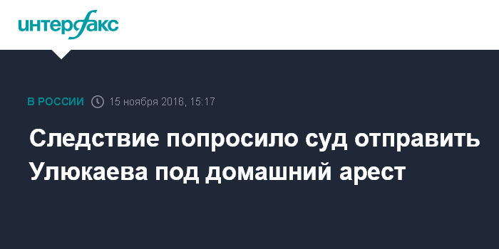 Москва. 15 ноября. INTERFAX.RU - Следственный комитет РФ направил в суд ходатайство об избрании в отношении министра экономического развития Алексея Улюкаева меры пресечения в виде домашнего ареста, сообщила "Интерфаксу" официальный представитель СКР Светлана Петренко.