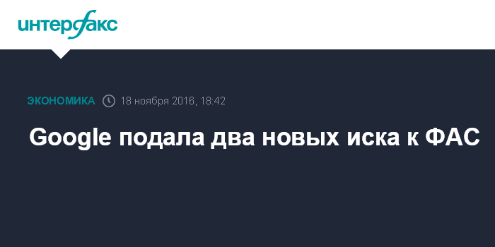 Москва. 18 ноября. INTERFAX.RU - Интернет-компания Google подала два новых иска к Федеральной антимонопольной службе РФ (ФАС), следует из картотеки арбитражного суда.