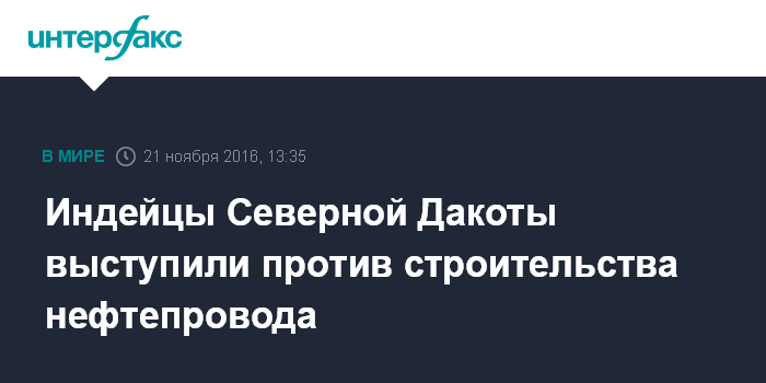 Москва. 21 ноября. INTERFAX.RU - Сотни жителей штата Северная Дакота выступили против прокладки нефтепровода Dakota Access Pipeline, ведущего из Северной Дакоты в Иллинойс.
