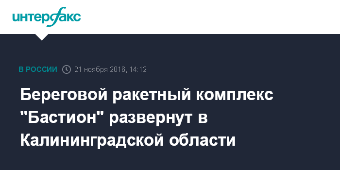 Москва. 21 ноября. INTERFAX.RU - Группировка войск в Калининградском особом районе усилена дивизионом берегового ракетного комплекса "Бастион", сообщил в понедельник "Интерфаксу" источник, знакомый с ситуацией.