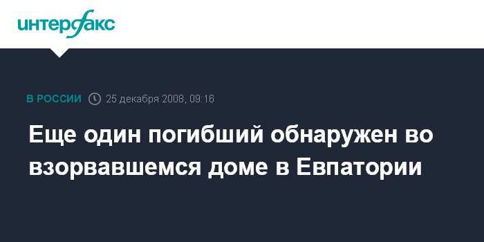 Москва. 25 декабря. INTERFAX.RU - Спасатели извлекли из-под завалов тело еще одного погибшего во взорвавшемся в среду вечером жилом доме в Евпатории.
