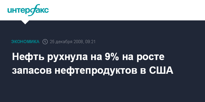 Москва. 25 декабря. INTERFAX.RU - Нефть рухнула на 9% на большем, чем ожидалось, росте коммерческих запасов нефтепродуктов в США, сообщило агентство Bloomberg.