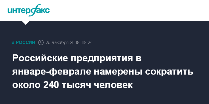 Москва. 25 декабря. INTERFAX.RU - Российские компании в январе-феврале 2009 г. планируют сократить около 240 тысяч сотрудников. Такие данные, основанные на мониторинге ситуации в более чем 9000 предприятий, привел вице-премьер РФ Александр Жуков.