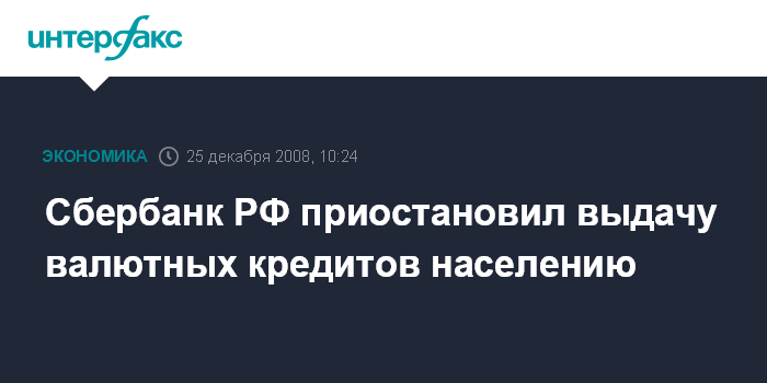 Москва. 25 декабря. INTERFAX.RU - Сбербанк России приостановил кредитование населения в иностранной валюте на неопределенный срок.
