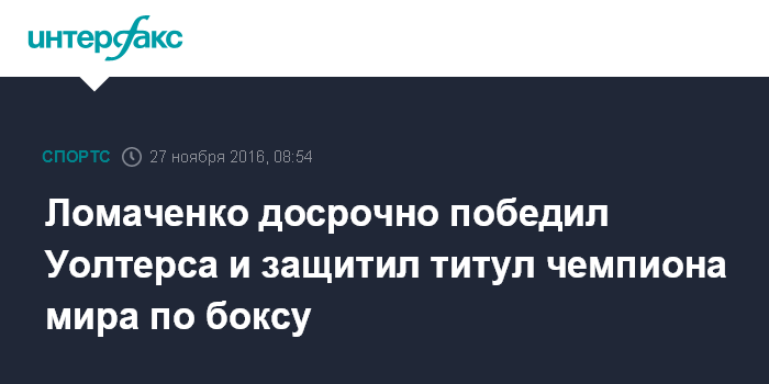 Москва. 27 ноября. INTERFAX.RU - Украинский боксер Василий Ломаченко в своем восьмом бою на профессиональном ринге досрочно завершил бой с непобедимым (26 побед и одна ничья) до этого дня ямайцем Николасом Уолтерсом.