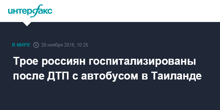 Москва. 28 ноября. INTERFAX.RU - Трое россиян пострадали в результате ДТП с туристическим автобусом на курорте Као Лак в провинции Пханг Нга в Таиланде, сообщает в понедельник местное издание Phuket News.