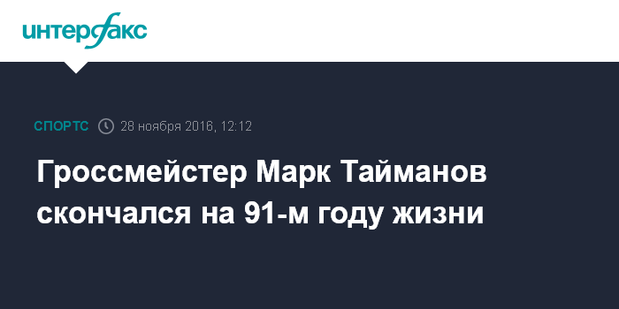 Москва. 28 ноября. INTERFAX.RU - Советский и российский шахматист, международный гроссмейстер Марк Тайманов скончался в Петербурге на 91-м году жизни, сообщили "Интерфаксу" в шахматной школе мастера.