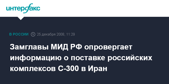 Москва. 25 декабря. INTERFAX.RU - МИД России опровергает информацию о поставках из РФ комплексов С-300 в Иран.