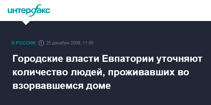 Москва. 25 декабря. INTERFAX.RU - В настоящее время городские власти Евпатории выясняют количество людей, проживающих в доме, где в среду вечером произошел взрыв, уточняются списки как зарегистрированных, так и проживающих без регистрации, сообщила агентству "Интерфакс-Украина" в четверг пресс-секретарь городского головы Евпатории Елена Гармашова.