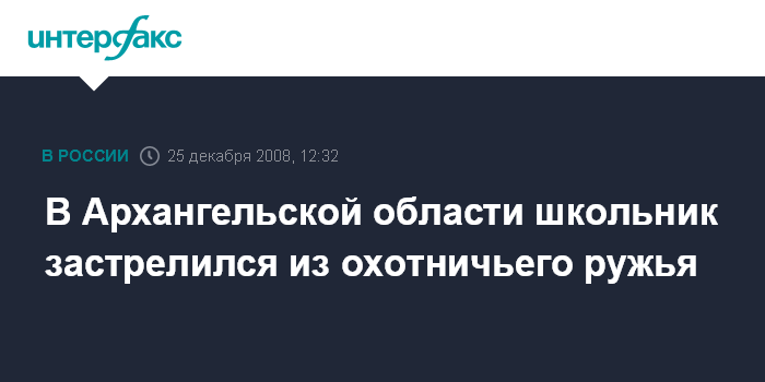 Как сообщили "Интерфаксу" в пресс-службе следственного управления СКП РФ по АО и HАО, 22 декабря около 19:00 в помещении бани в поселке Hово-Лавела Пинежского района Архангельской области был обнаружен труп несовершеннолетнего, который, по имеющимся данным, покончил жизнь самоубийством путем выстрела в голову из охотничьего ружья.