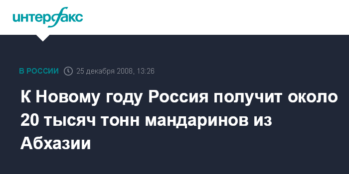Москва. 25 декабря. INTERFAX.RU - К новогодним праздникам Абхазия поставит в Россию порядка 20 тыс. тонн мандаринов, сообщил "Интерфаксу" глава государственного таможенного комитета республики Григорий Еник.