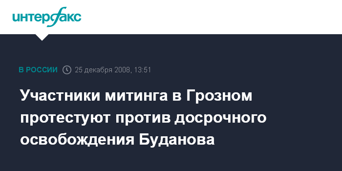 Москва. 25 декабря. INTERFAX.RU - Митинг протеста в связи с условно-досрочным освобождением из мест лишения свободы Юрия Буданова, осужденного за превышение должностных полномочий, похищение человека и убийство жительницы Чечни Эльзы Кунгаевой, начался в Сквере Журналистов в Грозном.