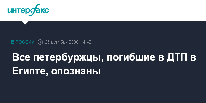 Москва. 25 декабря. INTERFAX.RU - В Петербурге завершилась процедура опознания шестерых погибших в автокатастрофе под Дахабом.