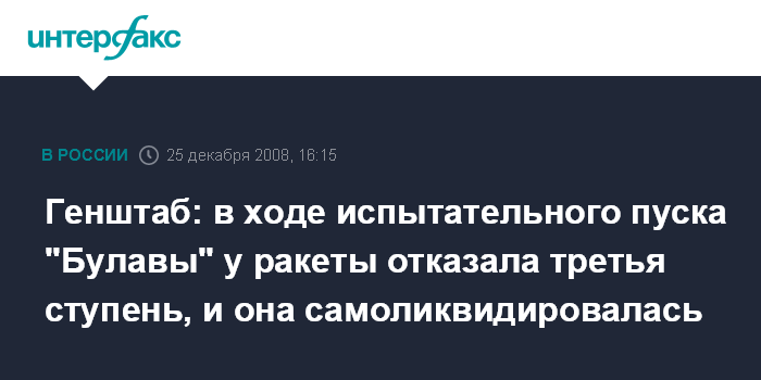Москва. 25 декабря. INTERFAX.RU - Испытательный пуск межконтинентальной баллистической ракеты "Булава" 23 декабря был неудачным, поскольку во время полета отказала третья ступень, и ракета самоликвидировалась, сообщил в четверг "Интерфаксу" начальник Генштаба Вооруженных сил РФ генерал армии Николай Макаров.