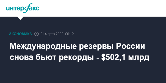 Москва. 21 марта. ИНТЕРФАКС-АФИ - Международные резервы России достигли нового рекордного значения. По состоянию на 14 марта их объем составил $502,1 млрд, сообщил департамент внешних и общественных связей Банка России.
