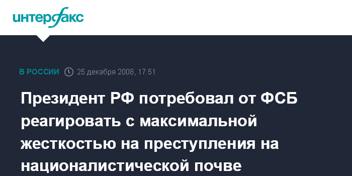 Москва. 25 декабря. INTERFAX.RU - Президент России Дмитрий Медведев поручил ФСБ максимально жестко реагировать на преступления на националистической почве.