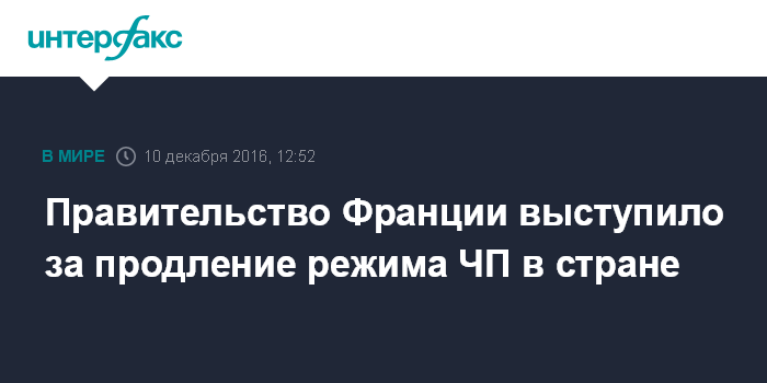 Москва. 10 декабря. INTERFAX.RU - Правительство Франции намерено выступить с предложением о продлении режима чрезвычайного положения в стране до 15 июля 2017 года, сообщил в субботу премьер-министр Бернар Казнев.