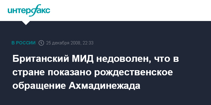 Лондон. 25 декабря. ИНТЕРФАКС - Решение четвертого канала британского общественного телевидения показать рождественское обращение президента Ирана Махмуда Ахмадинежада подверглось в четверг критике со стороны министерства иностранных дел Великобритании.