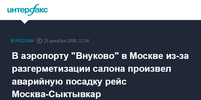 Москва.25 декабря. ИНТЕРФАКС-МОСКВА - В аэропорту "Внуково" в Москве из-за разгерметизации салона произвел аварийную посадку рейс Москва-Сыктывкар.