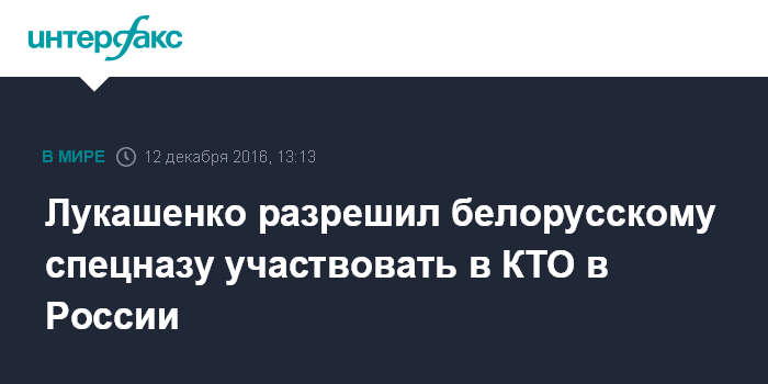 Москва. 12 декабря. INTERFAX.RU - Президент Александр Лукашенко своим указом одобрил проект международного договора об участии белорусских подразделений спецназначения в контртеррористических операциях на территории России.