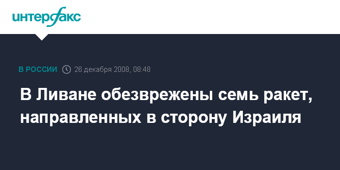 Москва. 26 декабря. INTERFAX.RU - Не менее семи ракет, готовых к пуску, обнаружены в Ливане на границе с Израилем, сообщает в пятницу со ссылкой на представителей ливанских властей израильская газета "Гаарец".
