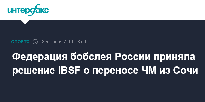 Ранее во вторник стало известно, что Международная федерация бобслея и скелетона (IBSF) перенесла чемпионат мира 2017 года по бобслею и скелетону из Сочи. Об этом сообщается на сайте организации. Чемпионат должен был пройти с 13 по 26 февраля в Красной Поляне. Новое место проведения турнира будет определено позднее.