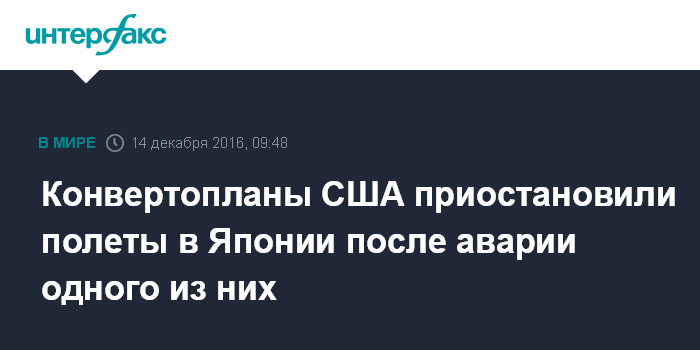 Москва. 14 декабря. INTERFAX.RU - Американское командование приняло решение приостановить полеты военных конвертопланов V-22 над Японией после того, как накануне один из них потерпел крушение у побережья японской префектуры Окинава, сообщают в среду японские СМИ.