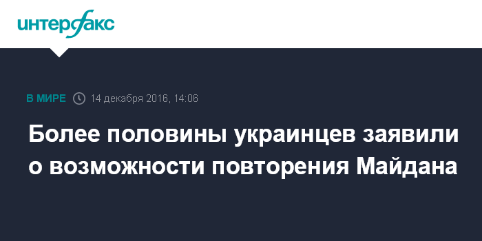 Москва. 14 декабря. INTERFAX.RU - Вероятность повторения Майдана в ближайшее время считают высокой 16,9% украинцев, еще 38,3% уверены, что такое развитие событий достаточно вероятно, следует из результатов опроса, проведенного центром социальных и маркетинговых исследований "Социс" и социологической группой "Рейтинг".