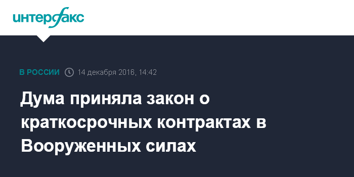 Москва. 14 декабря. INTERFAX.RU - Госдума в среду приняла во втором и сразу в третьем, окончательном чтении правительственный закон, предоставляющий военнослужащим возможность заключать краткосрочные контракты.
