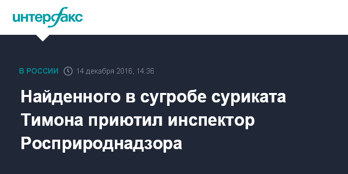 Москва. 14 декабря. INTERFAX.RU - Сурикат Тимон, найденный мурманским дворником в сугробе, обрел новый дом в семье инспектора экологического надзора Управления Росприроднадзора по Мурманской области.