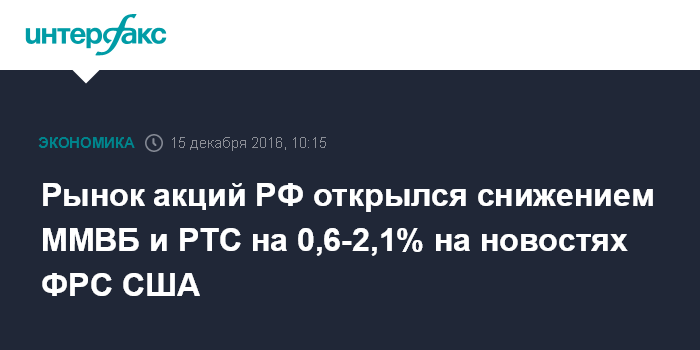 Москва. 15 декабря. INTERFAX.RU - Рынок акций РФ открылся в четверг снижением цен blue chips вслед за мировыми площадками после известий о вероятном ускорении роста ставок Федрезерва США в следующем году; индексы ММВБ и РТС за минуту торгов потеряли 0,6-2,1%.