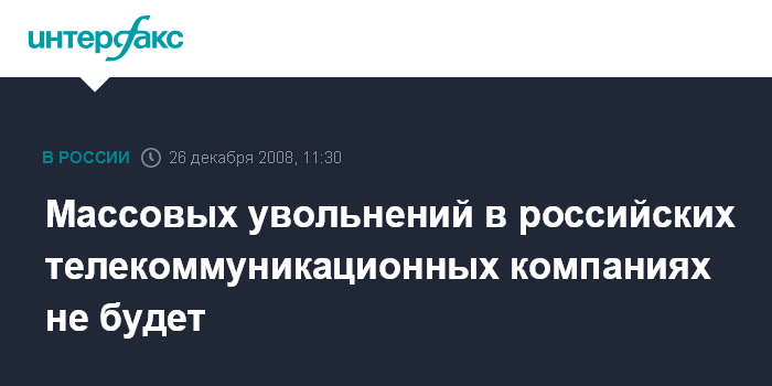 Москва. 26 декабря. INTERFAX.RU - Компании, работающие в телекоммуникационной отрасли, не будут проводить массовых сокращений персонала из-за ухудшения экономической ситуации, сообщил министр связи и массовых коммуникаций РФ Игорь Щеголев.