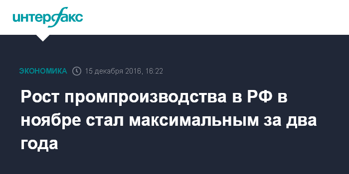 Москва. 15 декабря. INTERFAX.RU - Промышленное производство в РФ в ноябре 2016 выросло на 2,7% по сравнению с тем же месяцем 2015 года после снижения на 0,2% в октябре, падения на 0,8% в сентябре и роста на 0,7% в августе, сообщил в четверг Росстат.