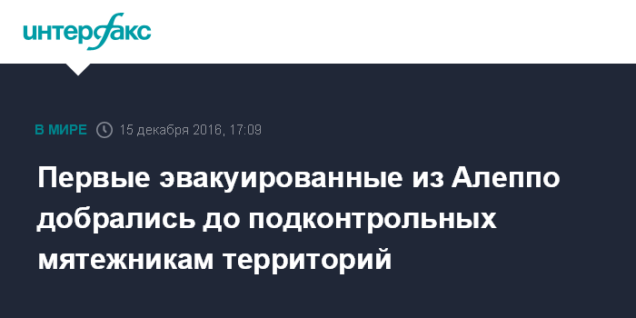 Москва. 15 декабря. INTERFAX.RU - Первая группа эвакуированных из Восточного Алеппо людей добралась до подконтрольных сирийским мятежникам территорий, сообщают европейские СМИ со ссылкой на собственные источники.