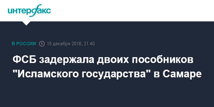 Москва. 15 декабря. INTERFAX.RU - Федеральная служба безопасности РФ сообщила о задержании в Самаре двоих пособников ИГ (террористическая организация, запрещенная в РФ).