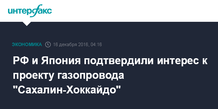 Москва. 16 декабря. INTERFAX.RU - Россия и Япония подтвердили взаимный интерес к проекту строительства газопровода "Сахалин-Хоккайдо", договорившись активизировать его проработку на уровне хозяйствующих субъектов, сообщила пресс-служба Минвостокразвития по итогам переговоров президента России Владимира Путина и премьер-министра Японии Синдзо Абэ в Нагато (префектура Ямагути). В переговорах, состоявшихся в четверг, принял участие министр РФ по развитию Дальнего Востока Александр Галушка.