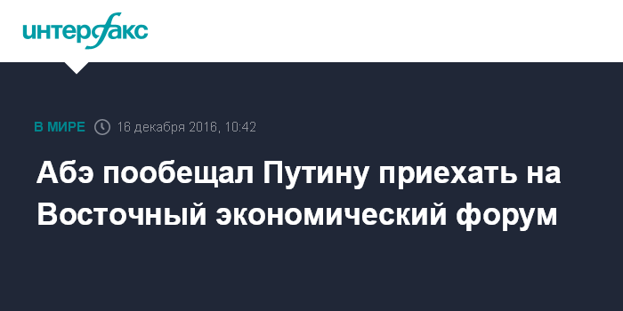 Москва. 16 декабря. INTERFAX.RU - Премьер-министр Японии Синдзо Абэ принял приглашение президента РФ Владимира Путина посетить в следующем году Восточно-экономический форум.