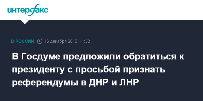 Москва. 16 декабря. INTERFAX.RU - В КПРФ предлагают обратиться к президенту РФ с просьбой признать итоги общенародных референдумов в самопровозглашенных Донецкой и Луганской народных республиках.