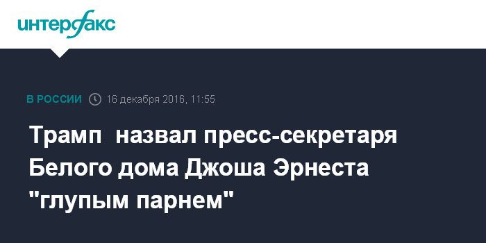 Москва. 16 декабря. INTERFAX.RU - Избранный президент США Дональд Трамп дал отрицательную характеристику пресс-секретарю Белого дома Джошу Эрнесту, сообщает американский телеканал NBC.