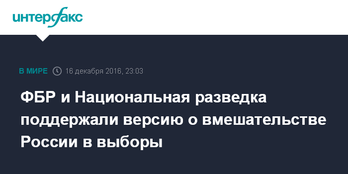 Москва. 16 декабря. INTERFAX.RU - Директор ФБР Джеймс Коми и директор Национальной разведки США Джеймс Клэппер-младший поддержали версию ЦРУ и вмешательстве России и процесс выборов президента страны в 2016 году, сообщила в пятницу The Washington Post со ссылкой на источники.