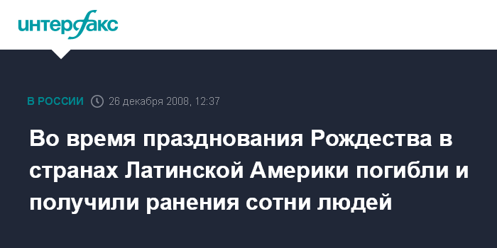 Москва. 26 декабря. INTERFAX.RU - Не менее ста человек погибли, еще 400 получили травмы во время празднования Рождества в странах Латинской Америки.