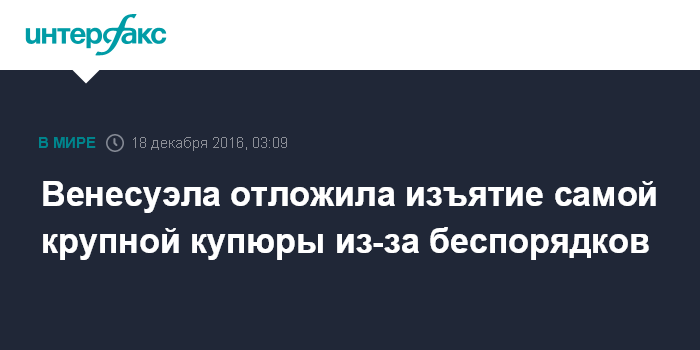 Москва. 18 декабря. INTERFAX.RU - Президент Венесуэлы Николас Мадуро принял решение отложить изъятие из оборота самой крупной купюры номиналом в 100 боливаров, сообщает в воскресенье "Би-Би-Си", объясняя это решение экономическим хаосом, охватившим страну. Мадуро назвал происходящее результатом "международного саботажа".