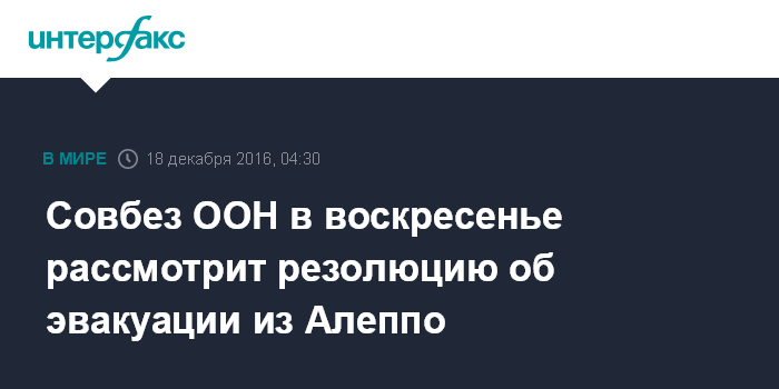Москва. 18 декабря. INTERFAX.RU - Совет Безопасности ООН в воскресенье вынесет на голосование резолюцию, которая предлагает облегчить эвакуацию людей из восточной части Алеппо и потребует доступа в этот город ООН и ее партнёрских организаций, сообщает постпредство Новой Зеландии при ООН.