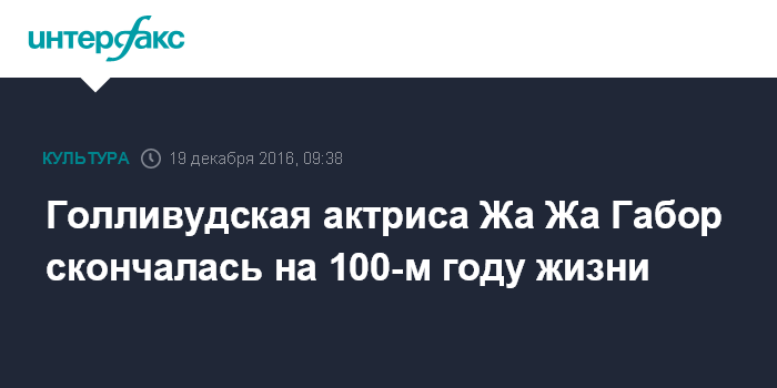 Москва. 19 декабря. INTERFAX.RU - Голливудская актриса венгерского происхождения Жа Жа Габор скончалась в возрасте 99 лет у себя дома в Лос-Анджелесе, сообщает Associated Press.