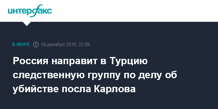 Москва. 19 декабря. INTERFAX.RU - Россия направит в Турцию следственную группу для расследования убийства посла Андрея Карлова, об этом договорились президенты РФ и Турции Владимир Путин и Реджеп Тайип Эрдоган в ходе состоявшегося сегодня телефонного разговора.