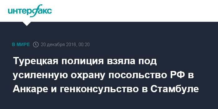 Москва. 20 декабря. INTERFAX.RU - Российское посольство в Анкаре и генконсульство в Стамбуле взяты под усиленную охрану после убийства российского посла Андрея Карлова. "К посольству России в Анкаре для обеспечения безопасности стянут полицейский спецназ", - сообщил турецкий телеканал NTV.