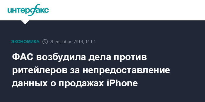 Москва. 20 декабря. INTERFAX.RU - Федеральная антимонопольная служба возбудила административные дела в связи с непредоставлением информации о реализации смартфонов Apple iPhone в отношении четырех компаний-дистрибуторов и ритейлеров. Дела возбуждены в отношении ООО "Кронар", ООО "Хаскел", ООО "Гримбор" и ООО "Максимум", говорится в сообщении ФАС. "Кронар" и "Гримбор" неоднократно не ответили на запросы ведомства.