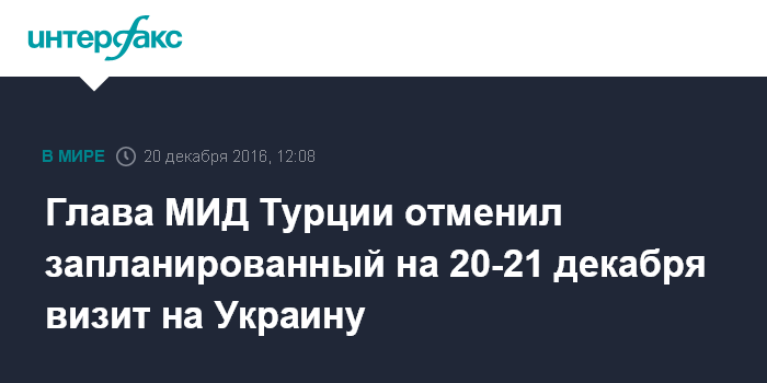 Москва. 20 декабря. INTERFAX.RU - Министр иностранных дел Турции Мевлют Чавушоглу отменил запланированный на 20-21 декабря визит на Украину, сообщили агентству "Интерфакс-Украина" в посольстве Турции на Украине.