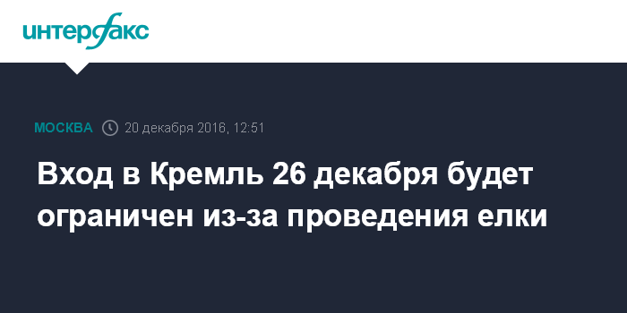Москва. 20 декабря. INTERFAX.RU - Допуск граждан в Московский Кремль в понедельник, 26 декабря, в связи с проведением Общероссийской новогодней елки проводиться не будет, сообщили во вторник в центре по связям с прессой и общественностью Федеральной службы охраны РФ.