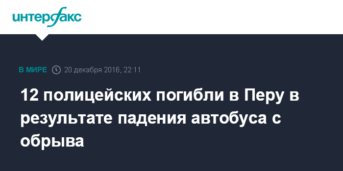 Москва. 20 декабря. INTERFAX.RU - Двенадцать полицейских погибли и 13 получили ранения во вторник в результате падения автобуса с 300-метрового обрыва в провинции Апуримак, сообщает перуанское радио.